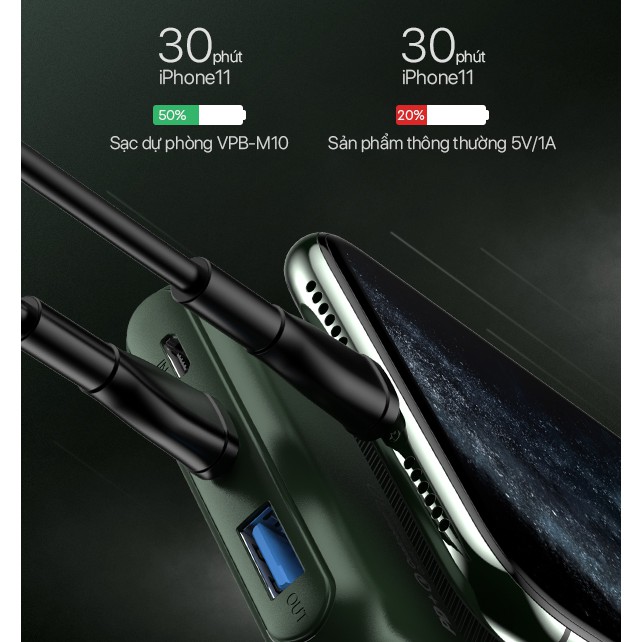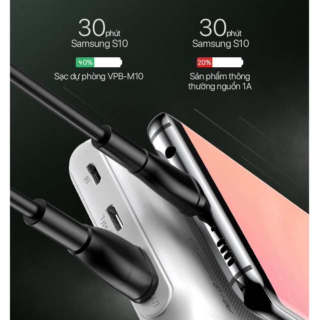 Sạc dự phòng VPB-M10 sạc đầy trong 190 phút khi sử dụng củ sạc nhanh 18W qua cổng Type-C hoặc Micro.