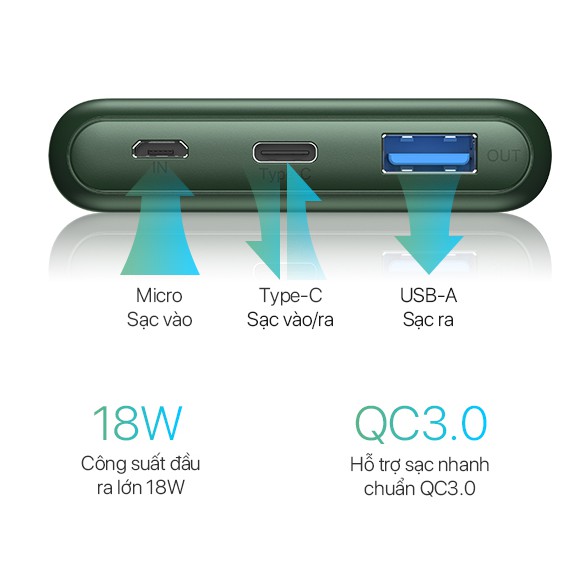 Hai cổng đầu vào Micro và Type-C. Hỗ trợ sạc nhanh chuẩn PD với cổng Type-C, sạc công suất lớn 18W sạc vào và sạc ra
