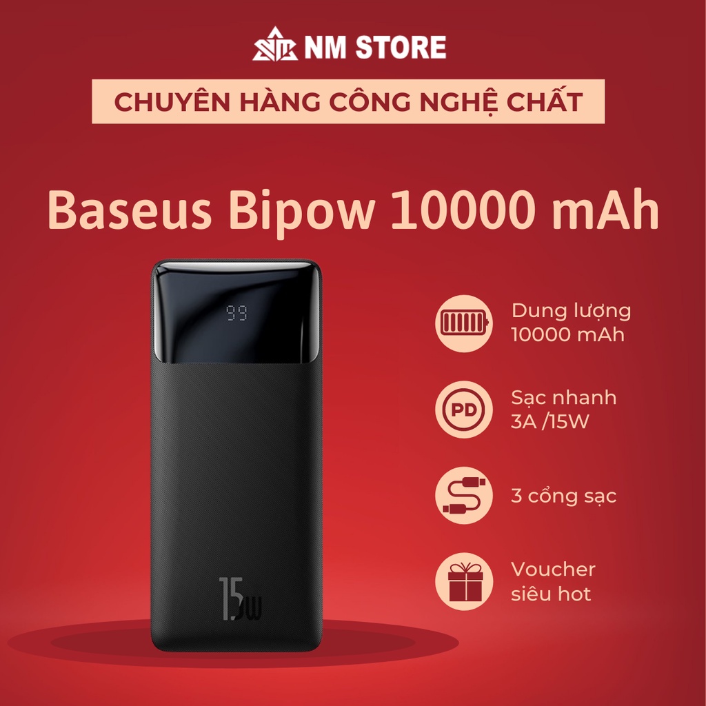 Pin dự phòng 15W Baseus Digital Display dung lượng 10000mAh, 3 Output, màn hình LCD hiện thị pin, thân vỏ nhámThương hiệu : Baseus