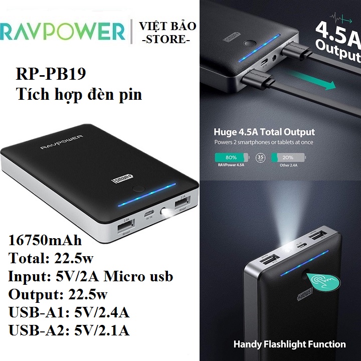 #ravpower, #pinravpower, #pin_ravpower, #sạc_ravpower, #pin_2_cổng, #16750mah, #PB19, #sạc_dự_phòng_eavpower, #đèn_pin, #đèn_flast