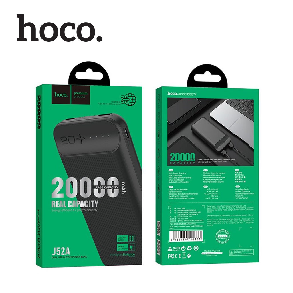 Giới thiệu Pin sạc dự phòng 20000mAh Hoco J52A, 2 Output USB hỗ trợ sạc tốc độ 5V/2A, có đèn LED báo dung lượng pin