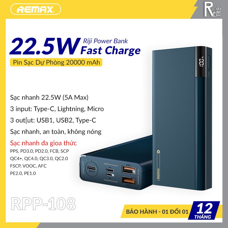 Giới thiệu Pin Sạc Dự Phòng 20000mAh Remax RPP-108 Lõi Pin Polyme, Sạc Nhanh 2 Chiều, Không Nóng, Hỗ Trợ QC3.0, PD3.0, Chống Cháy