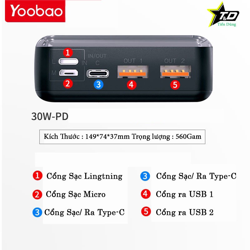Giới thiệu Pin sạc dự phòng 30.000mAh yoobao Công nghệ sạc nhanh 2 chiều PD3.0 (PPS) 18W; 3 cổng vào: micro- USB, Lightning, Type-C