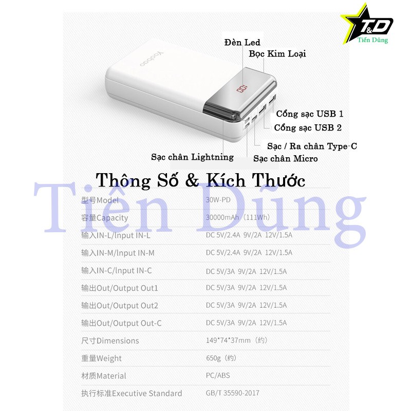 Pin sạc dự phòng 30.000mAh yoobao Công nghệ sạc nhanh 2 chiều PD3.0 (PPS) 18W; 3 cổng vào: micro- USB, Lightning, Type-C.Thông số kỹ thuật: