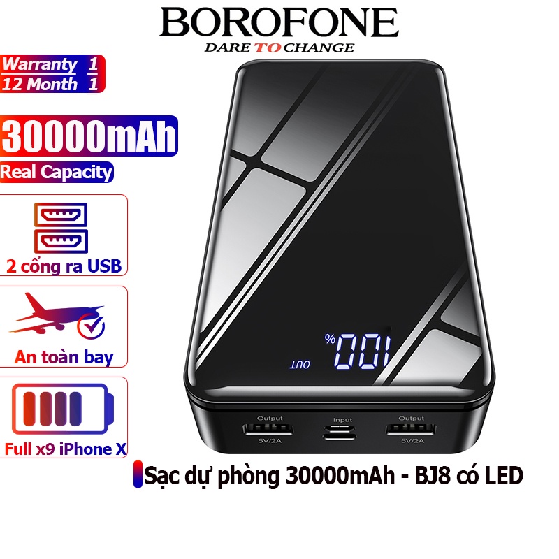 Pin sạc dự phòng 30000mAh BOROFONE BJ8 đèn LED hiển thị, 2 cổng ra 2A - Chính hãng