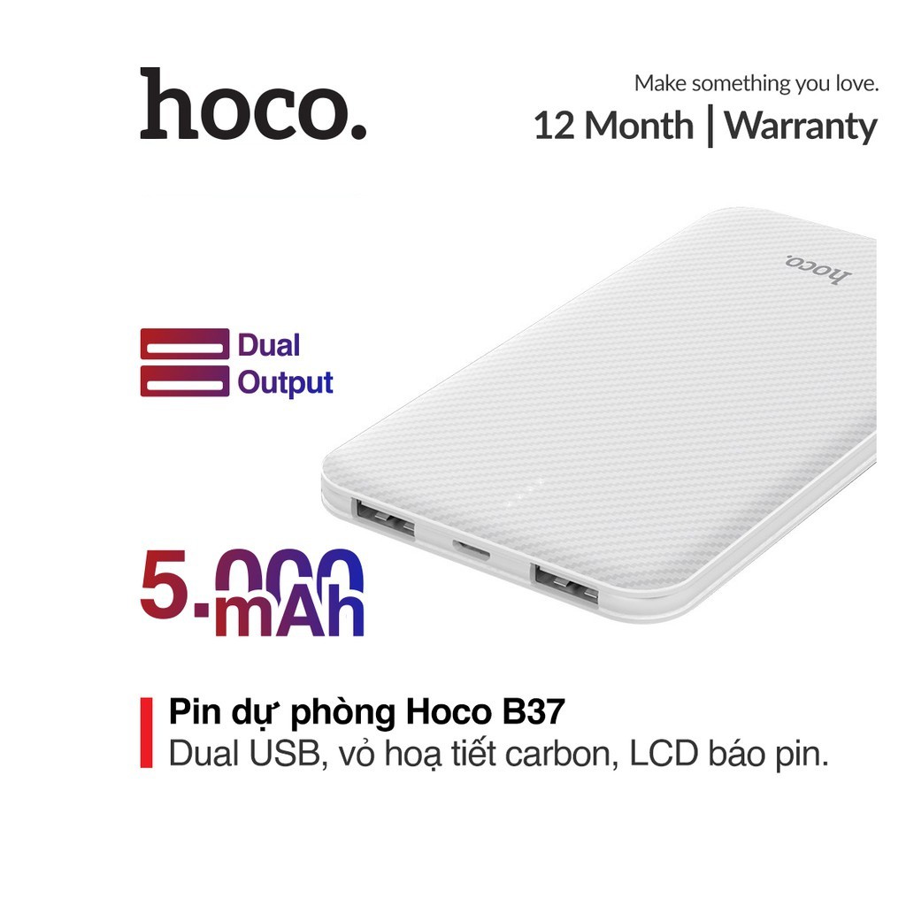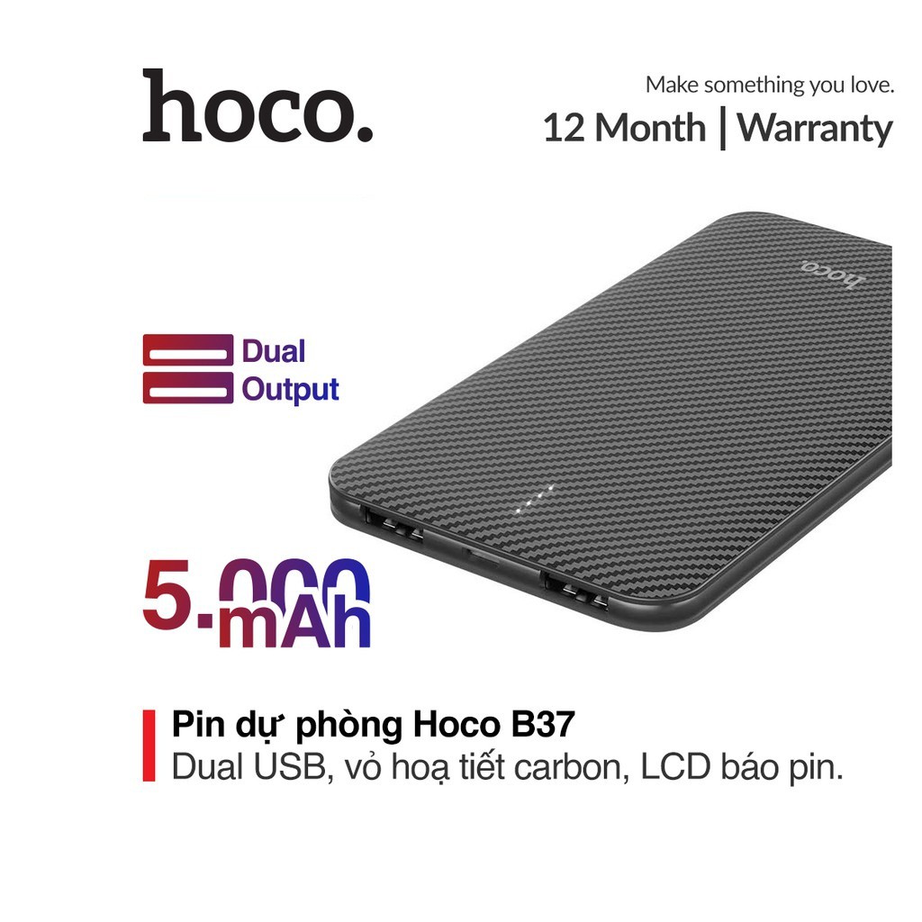 Pin sạc dự phòng 5000mAh Hoco B37 họa tiết carbon chất liệu ABS + PC tích hợp màn hình Led hiển thị"Bảo hành: 12 tháng, 1 đổi 1 trong tháng đầu nếu lỗi do nhà sản xuất.