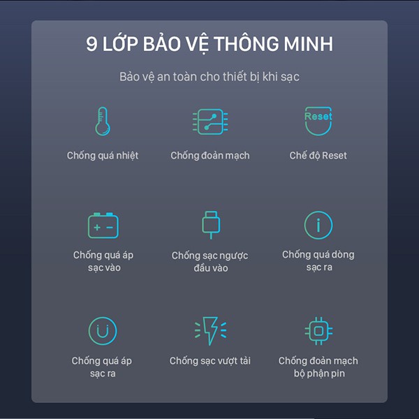 9 lớp bảo vệ thông minh: chống quá nhiệt, chống đoản mạch, chế độ Reset, chống quá áp sạc vào, chống ngược khi sạc vào, chống quá dòng sạc ra, chống quá áp sạc ra, chống chập, chống quá áp đoản mạch
