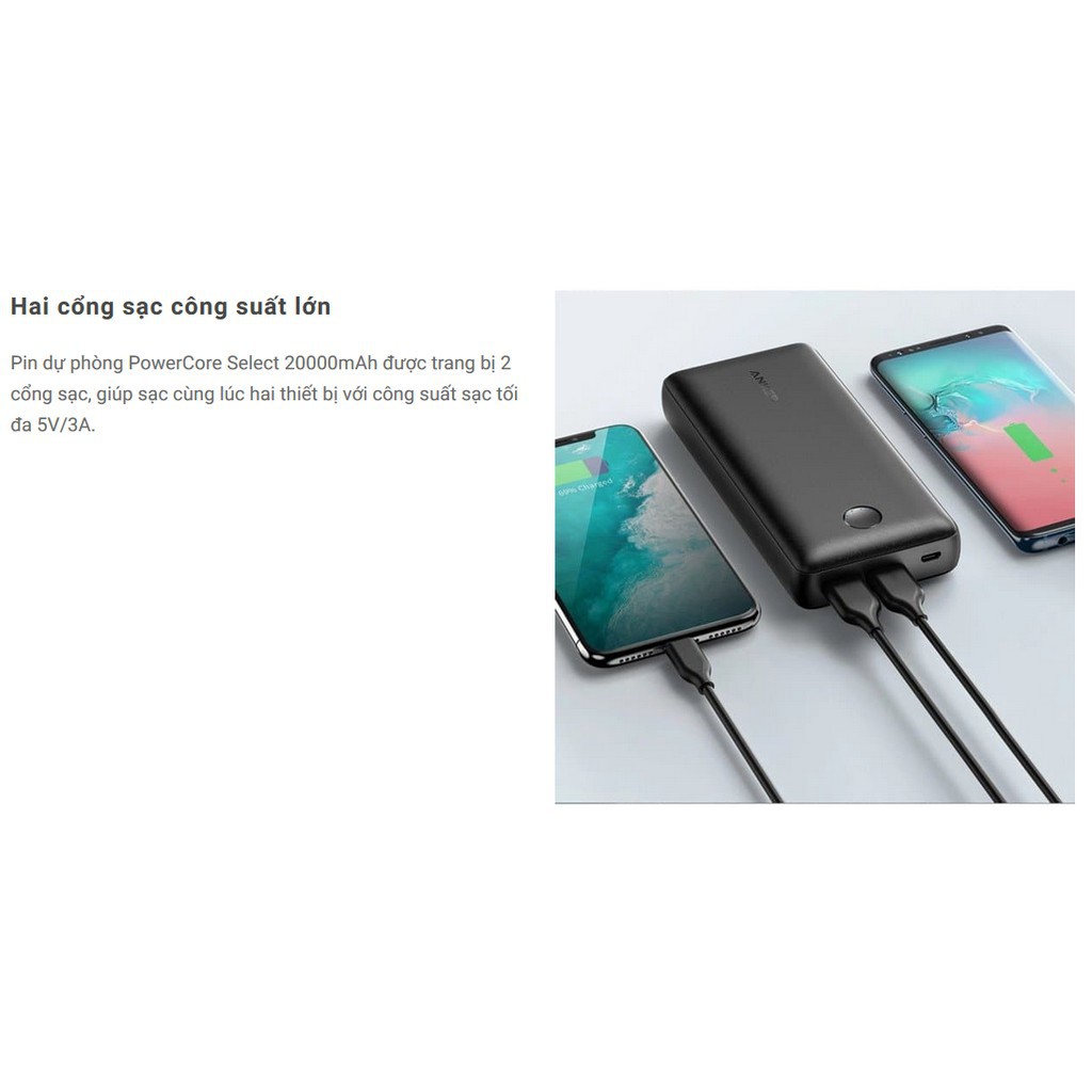Hai cổng sạc công suất lớn: Pin dự phòng PowerCore Select 20000mAh được trang bị 2 cổng sạc, giúp sạc cùng lúc hai thiết bị với công suất sạc tối đa 5V/3A.