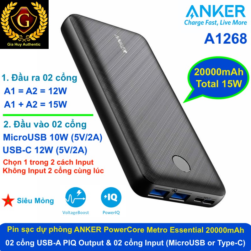 Điện Thoại & Phụ Kiện > Pin sạc dự phòng > 10000 - 20000mAh || Pin sạc dự phòng ANKER PowerCore METRO Essential 20000mAh - A1268Còn hàng
