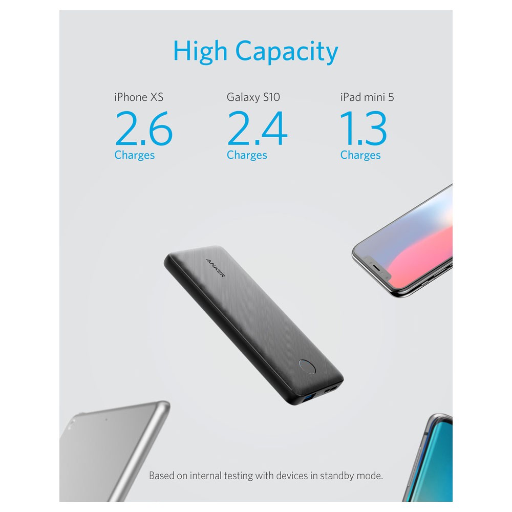 Có kích thước mỏng và nhẹ nhưng lại có dung lượng lớn. Đủ cung cấp cho iPhone XS, iPhone X, Samsung Galaxy S9 2.6 lần sạc và 2.4 lần sạc cho Samsung Galaxy S10 và 1.3 lần sạc cho iPad Mini 5.