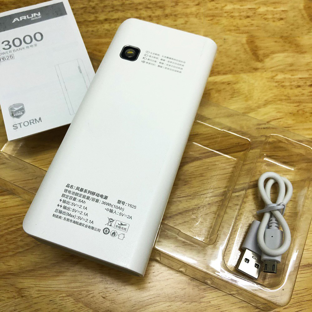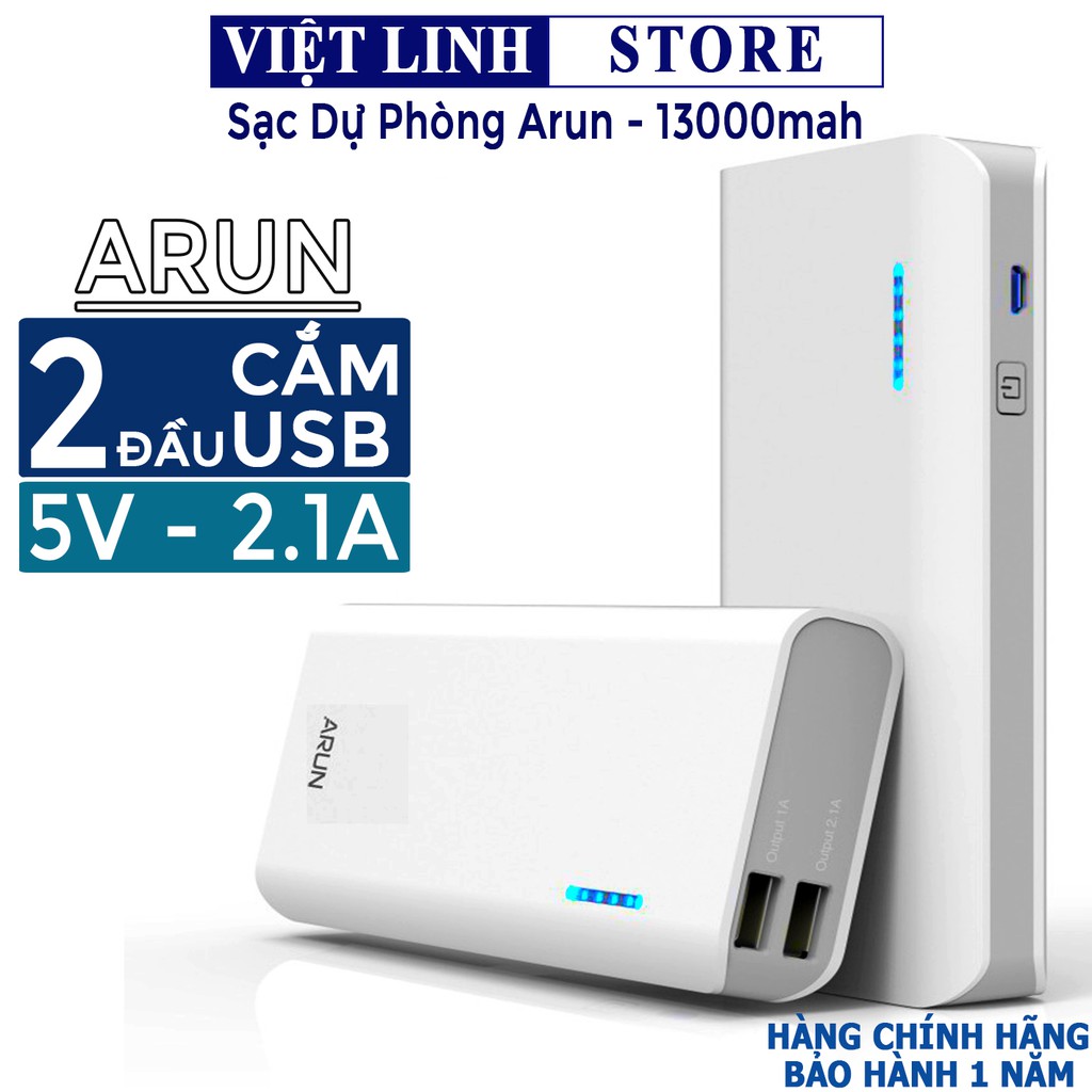 Pin Sạc Dự Phòng Arun 13000mah, 2 đầu USB sạc nhanh, có đèn Led kèm đèn pin - BH 1 Năm | Arun Y625 13000mah
