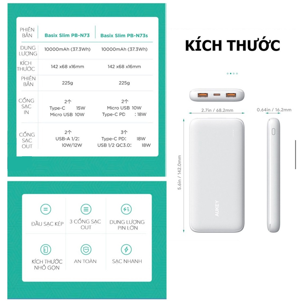 Giới thiệu Pin Sạc Dự Phòng Aukey PB-N73 / N73S 10000mAh PD 18W 1C+1A,2 Cổng USB-C Sạc Nhanh PD 18W + USB-A QC 3.0 18W
