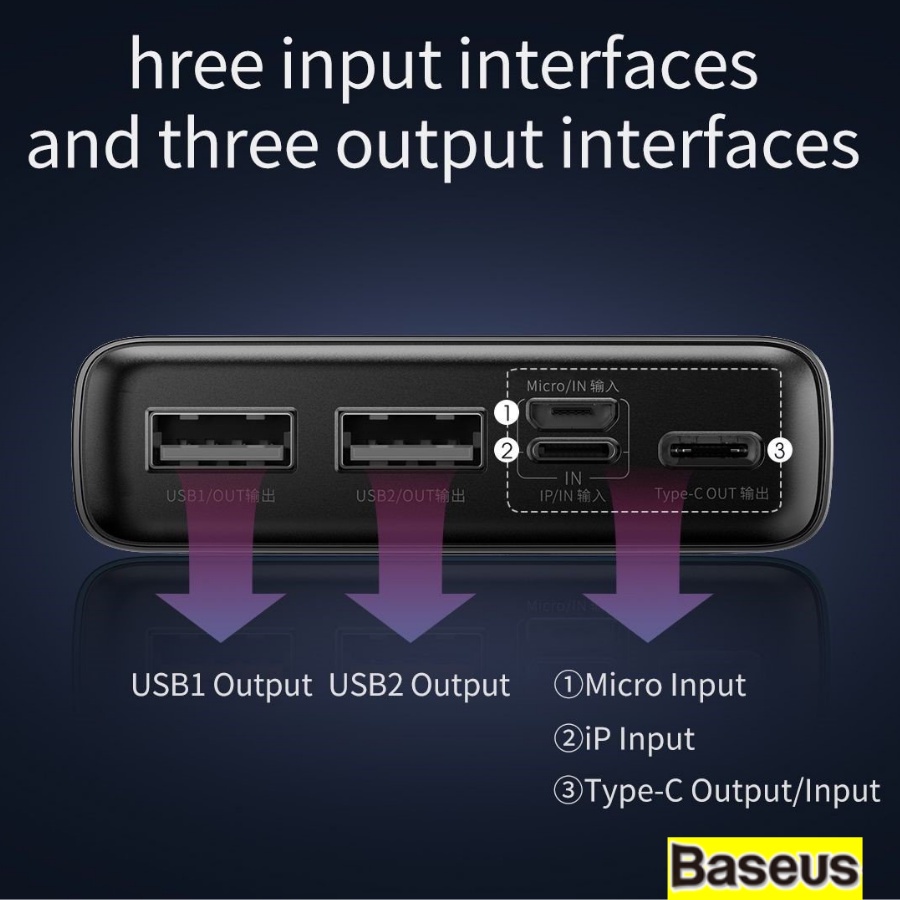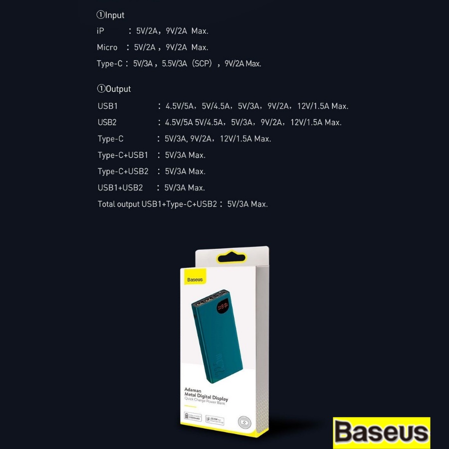 - Pin sạc dự phòng Baseus Adaman có dung lượng 20,000mAh, hỗ trợ hầu hết các chuẩn sạc nhanh hiện nay, tương thích với hầu hết các thiết bị số hiện nay từ Macbook/ Laptop (hỗ trợ sạc qua cổng Type C support PD) cho đến Smartphone/ Tablet ... Dung lượng lớn, công suất cao (lên đến 22.5W) có 3 port (2 USB + 1 Type C). Cả 3 Port này đều hỗ trợ sạc nhanh (QC3.0 và PD3.0), có thể dùng sạc pin cho cả 3 thiết bị cùng lúc . Giúp bạn sử dụng thoải mái hơn và quên đi nổi lo hết pin khi đi công tác, du lịch, giả ngoại ... Giúp cho mọi thiết bị của bạn luôn trong tình trạng sẳn sàng sử dụng.
