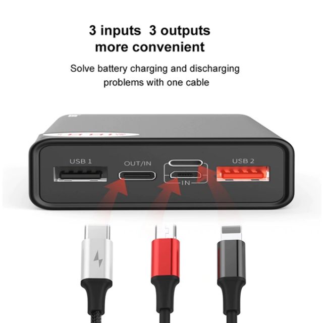 Với đầu ra kép USB và đầu vào / đầu ra PD Type-C + Đầu vào Micro USB + Cổng đầu vào Lightning, thuận tiện để sạc.
