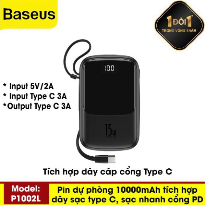 THÔNG TIN Pin Sạc Dự Phòng Baseus 10000mah Công Xuất 15W Power Bank Output 3A Tích Hợp Cáp Sạc Type C