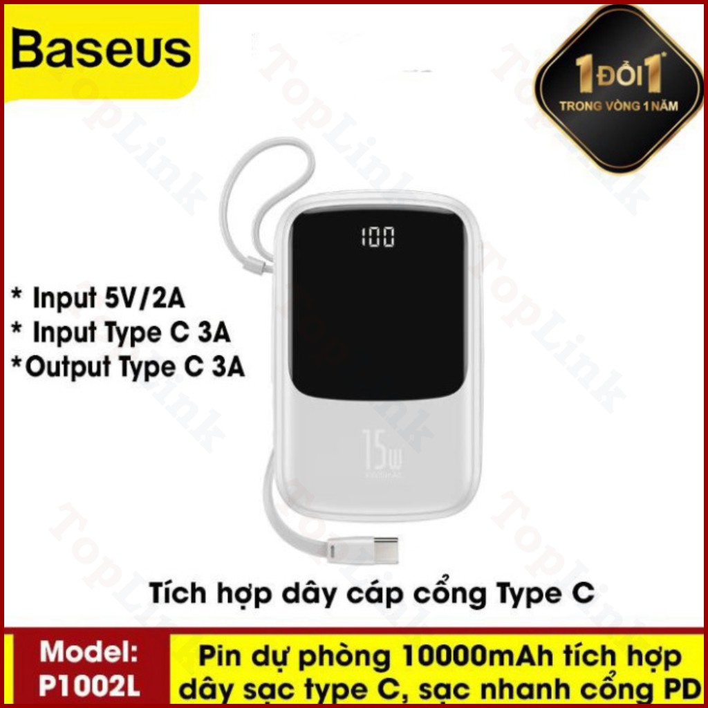 Pin Sạc Dự Phòng Baseus 10000mah Công Xuất 15W Power Bank Output 3A Tích Hợp Cáp Sạc Type C - TopLink