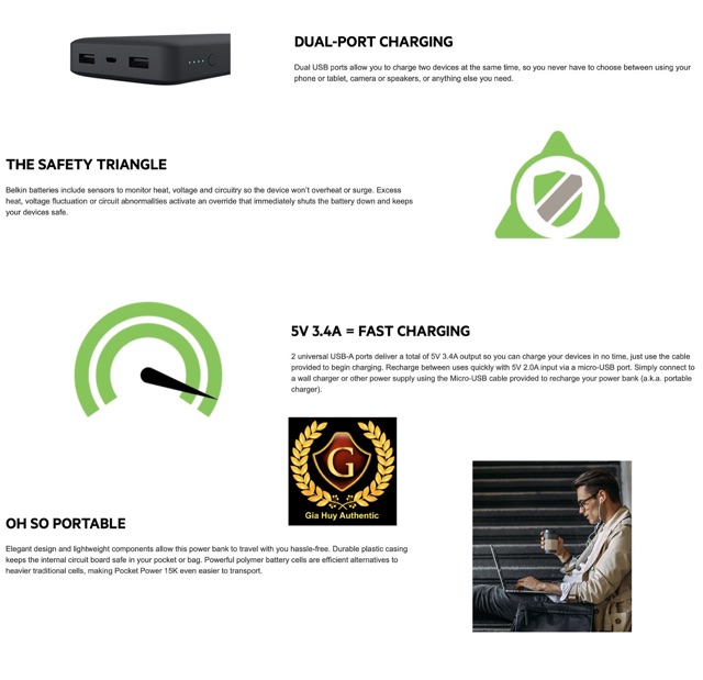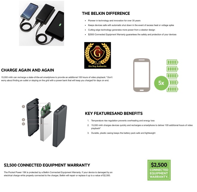 Pocket Power 15.000mAh được bảo vệ bởi Bảo hành Thiết bị được Kết nối Pin Belkin. Nếu thiết bị của bạn bị hỏng do sạc điện trong khi được kết nối đúng với Pin Belkin này, Belkin sẽ sửa chữa hoặc thay thế với chị phí lên đến 2.500 USD cho bạn