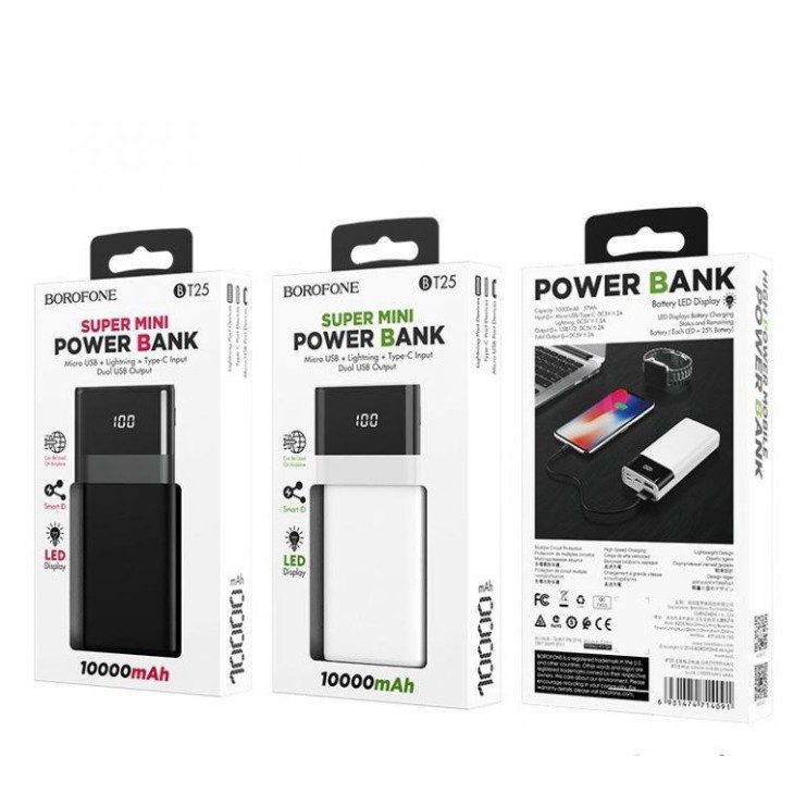 Pin Sạc Dự Phòng BOROFONE BT25 10000mah, 2 cổng ra USB 2A, 2 cổng vào Micro USB / Type C, Màn hình Led hiện dung lượng pinTHÔNG SỐ SẢN PHẨM: