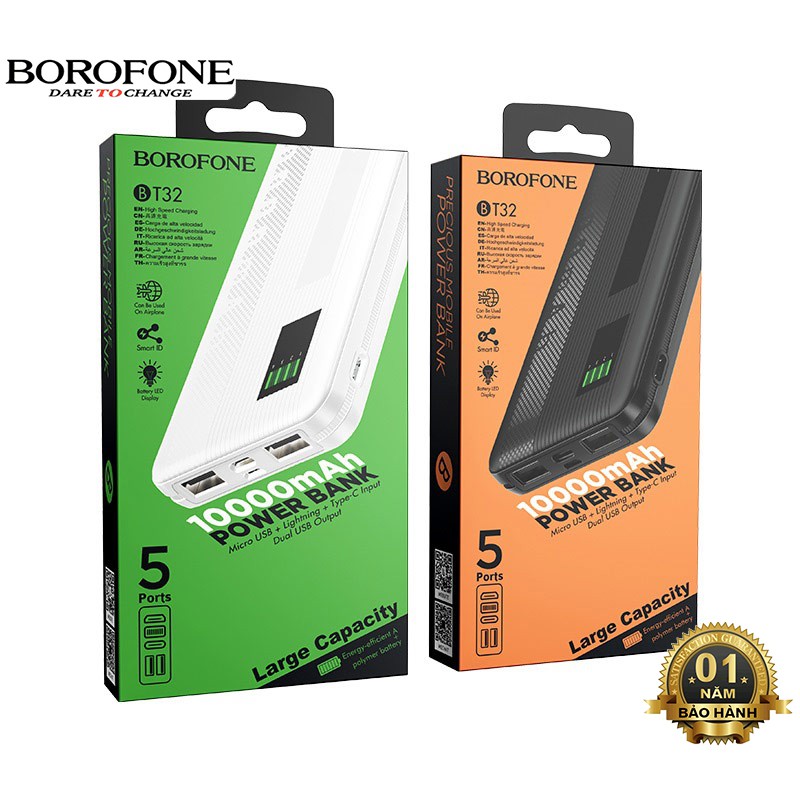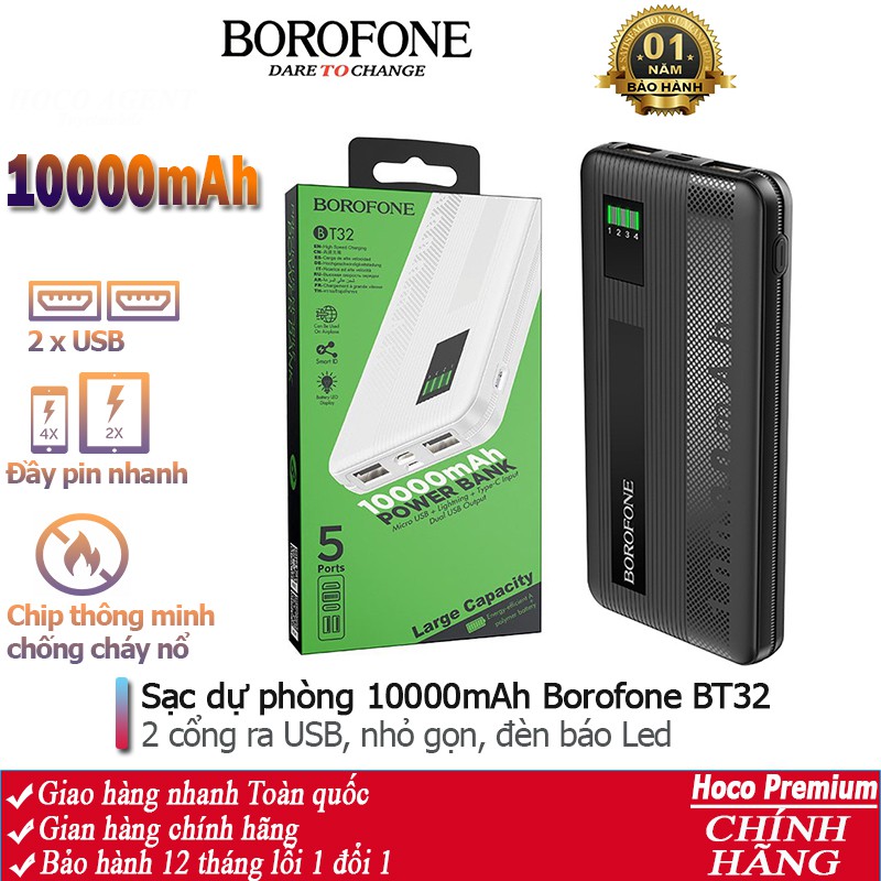 Pin sạc dự phòng Borofone BT32 đèn báo LED, 2 cổng ra, tích điện dung lượng 10000mAh - Chính hãng