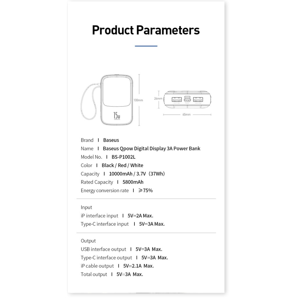 Giới thiệu Pin Sạc Dự Phòng BS-P1001L 10000mah Power Bank 3A Công Suất 15W Tích Hợp Cáp Sạc Lightning Cho Iphone, hỗ trợ sạc nhanh