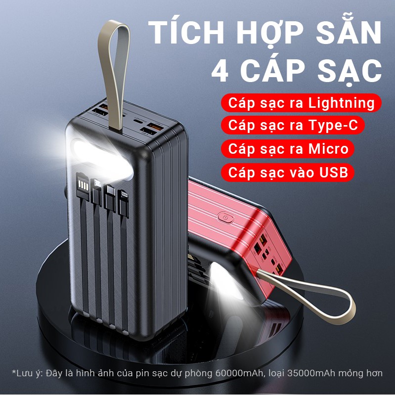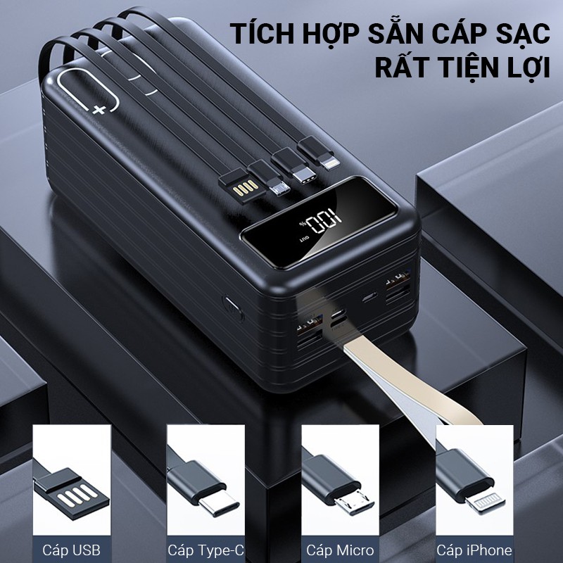 - Được tích hợp thêm 4 cáp sạc gồm 1 cáp sạc vào USB, 3 cáp sạc ra Micro/Type-C/Lightning
