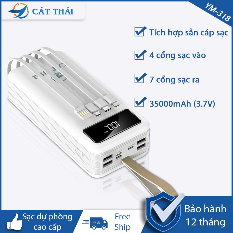 Điện Thoại & Phụ Kiện > Phụ kiện > Sạc dự phòng & Pin > Sạc dự phòng || Pin sạc dự phòng Cát Thái YM-318 35000mAh hỗ trợ sạc nhanh 2.1A, tích hợp sẵn cáp sạc trên pin, 7 cổng ra, 4 cổng vàoCòn hàng