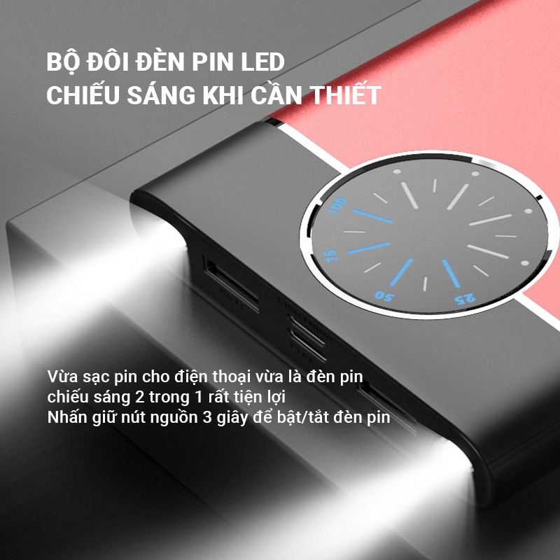 - Pin còn trang bị 2 đèn pin LED chiếu sáng trong đêm, vừa là pin sạc vừa là đèn pin 2 trong 1 rất tiện dụng