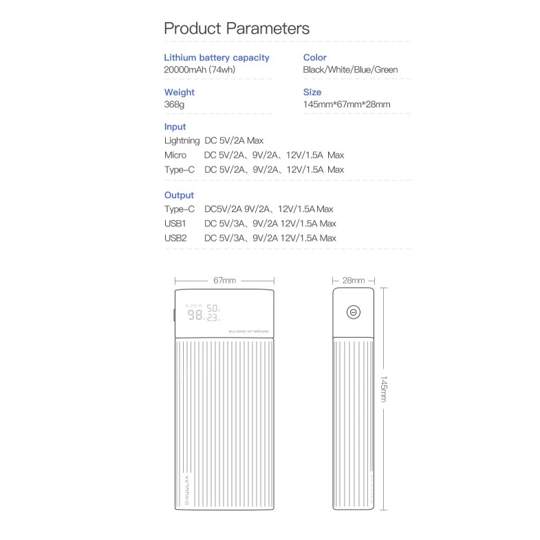 * Dung lượng pin: 20000mAh /3.8V 76Wh