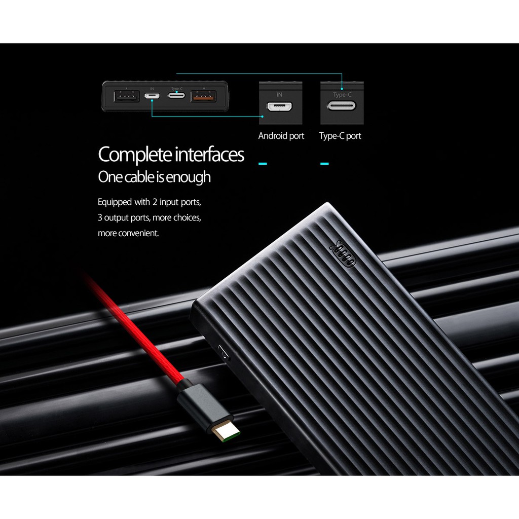 ORICO K10000 được trang được trang bị 3 loại cổng sạc cho thiết bị di động bao gồm USB, micro USB và Type-C, hỗ trợ chuẩn sạc nhanh QC 3.0/2.0, thuận tiện trong việc lựa chọn đầu sạc và rút ngắn khoảng thời gian hơn 4 lần so với chuẩn sạc thông thường.