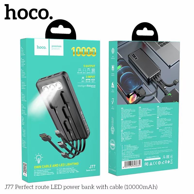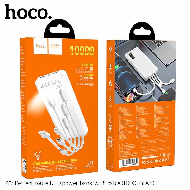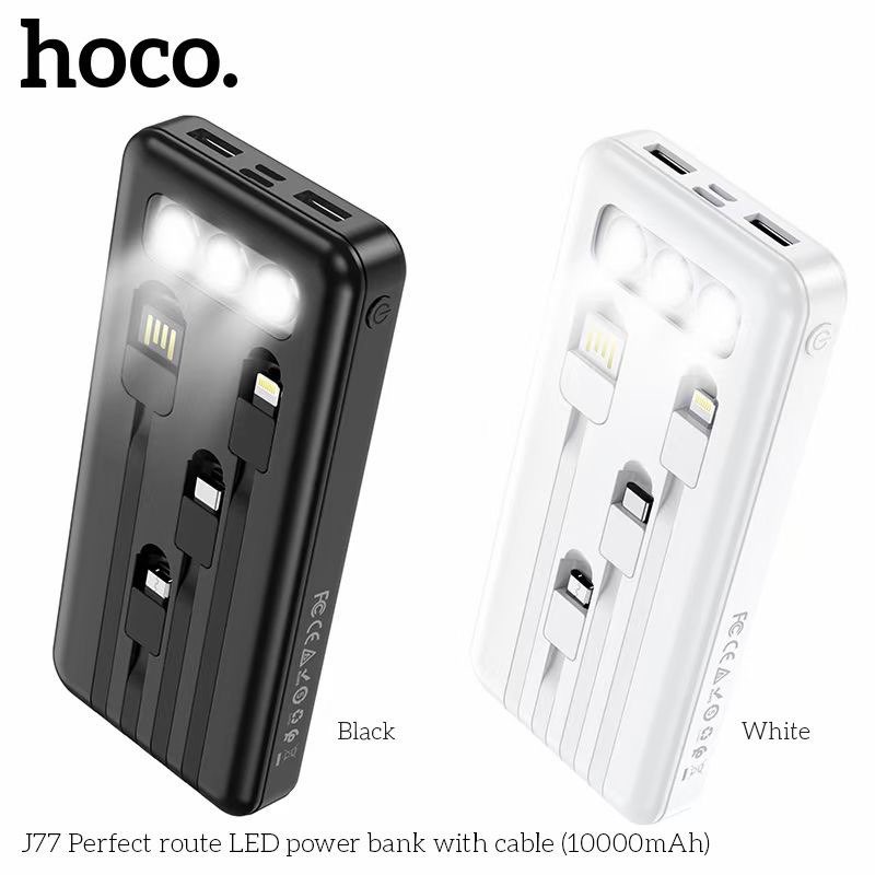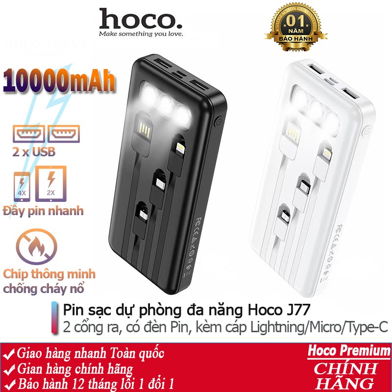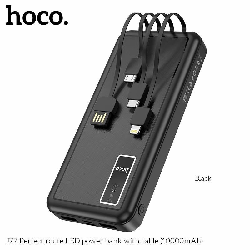 Pin sạc dự phòng đa năng Hoco J77 (10000mAh) đèn LED hiển thị, kèm cáp liền Ligntning, Micro, Type-C - Chính hãngSạc dự phòng đa năng Hoco J77 dung lượng 10000mAh, công suất tiêu thụ, tiêu hao khi sạc đạt 70%, có thể sạc đầy từ 2-2,5 lần cho điện thoại dung lượng pin 3000mAh (như iPhone XS Max hoặc Samsung S10 Plus) tích hợp 2 cổng ra USB, 2 cổng vào MicroUSB và Type C để cắm điện cho SDP này. Đặc biệt J77 còn tích hợp 3 dây cáp sạc ngắn, liền với sạc dự phòng chân cắm cổng Lightning / Micro / Type-C rất tiện dụng, J77 có 3 bóng đèn Pin để đọc sách trong trường hợp mất điện. J77 sạc cho tất cả các thiết bị điện thoại Smartphone và máy tính bảng.