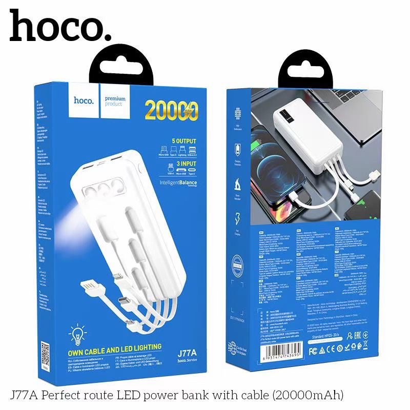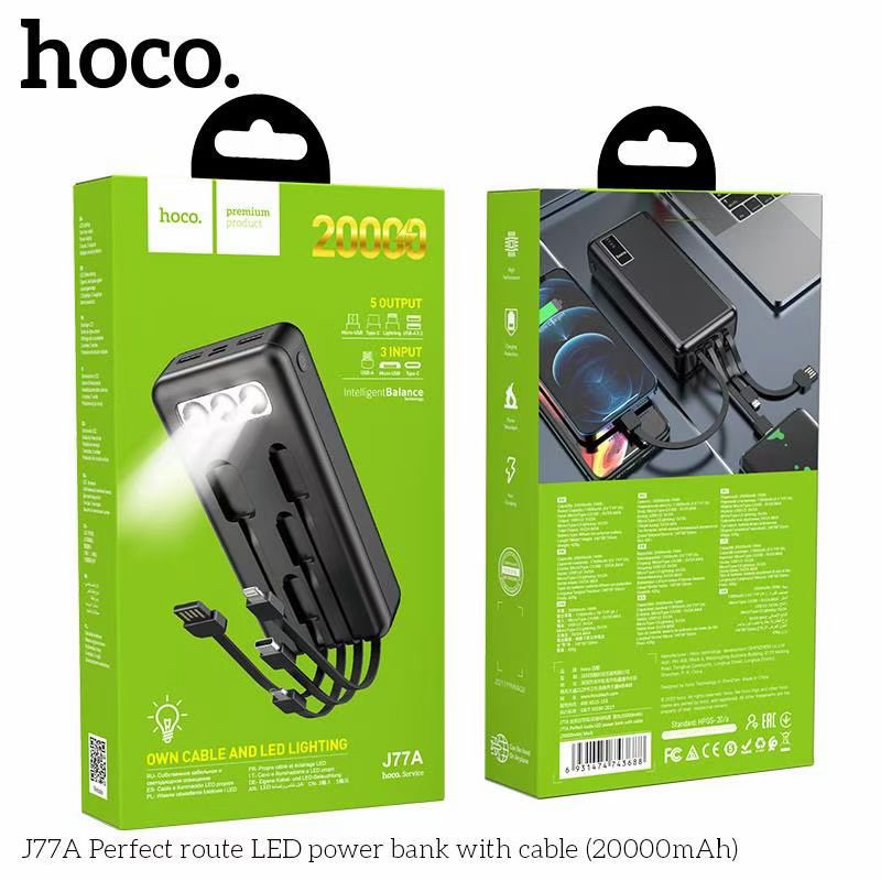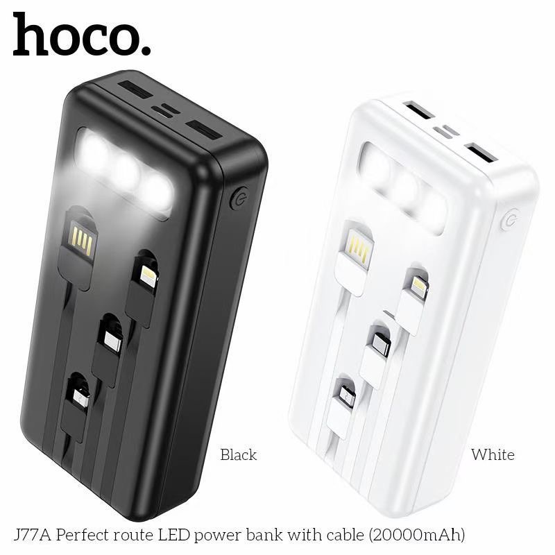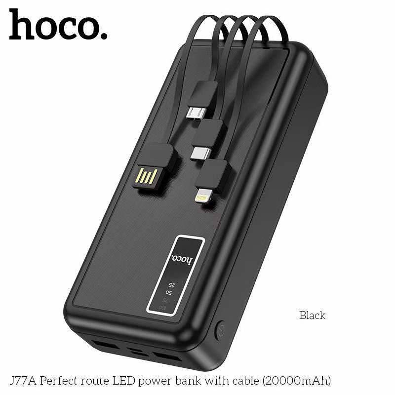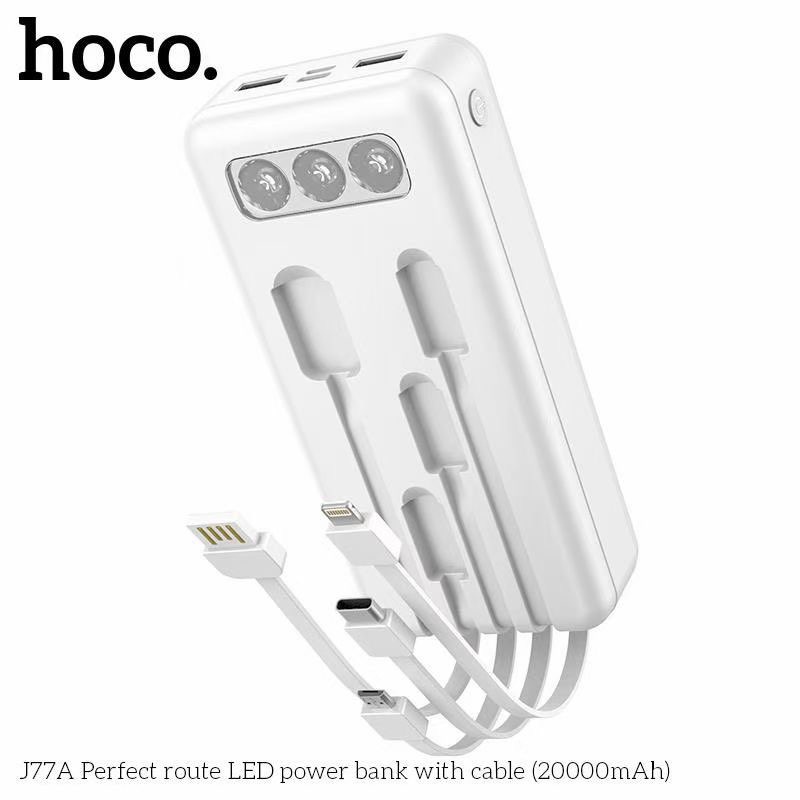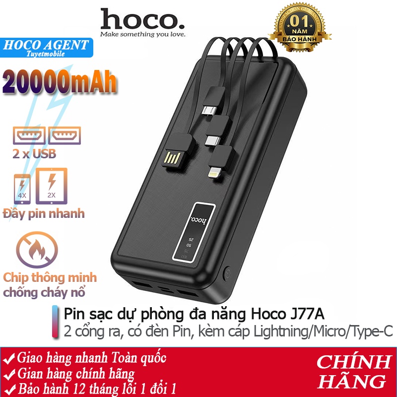 Pin sạc dự phòng đa năng Hoco J77A (20000mAh) đèn LED hiển thị, kèm cáp liền Ligntning, Micro, Type-C - Chính hãngSạc dự phòng đa năng Hoco J77A dung lượng 20000mAh, công suất tiêu thụ, tiêu hao khi sạc đạt 70%, có thể sạc đầy từ 4-4,5 lần cho điện thoại dung lượng pin 3000mAh (như iPhone XS Max hoặc Samsung S10 Plus) tích hợp 2 cổng ra USB, 2 cổng vào MicroUSB và Type C để cắm điện cho SDP này. Đặc biệt J77A còn tích hợp 3 dây cáp sạc ngắn, liền với sạc dự phòng chân cắm cổng Lightning / Micro / Type-C rất tiện dụng, J77A có 3 bóng đèn Pin để đọc sách trong trường hợp mất điện. J77A sạc cho tất cả các thiết bị điện thoại Smartphone và máy tính bảng.