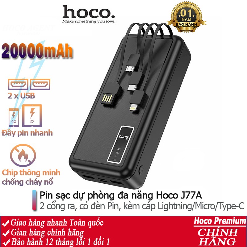 Pin sạc dự phòng đa năng Hoco J77A (20000mAh) đèn LED hiển thị, kèm cáp liền Ligntning, Micro, Type-C - Chính hãngSạc dự phòng đa năng Hoco J77A dung lượng 20000mAh, công suất tiêu thụ, tiêu hao khi sạc đạt 70%, có thể sạc đầy từ 4-4,5 lần cho điện thoại dung lượng pin 3000mAh (như iPhone XS Max hoặc Samsung S10 Plus) tích hợp 2 cổng ra USB, 2 cổng vào MicroUSB và Type C để cắm điện cho SDP này. Đặc biệt J77A còn tích hợp 3 dây cáp sạc ngắn, liền với sạc dự phòng chân cắm cổng Lightning / Micro / Type-C rất tiện dụng, J77A có 3 bóng đèn Pin để đọc sách trong trường hợp mất điện. J77A sạc cho tất cả các thiết bị điện thoại Smartphone và máy tính bảng.