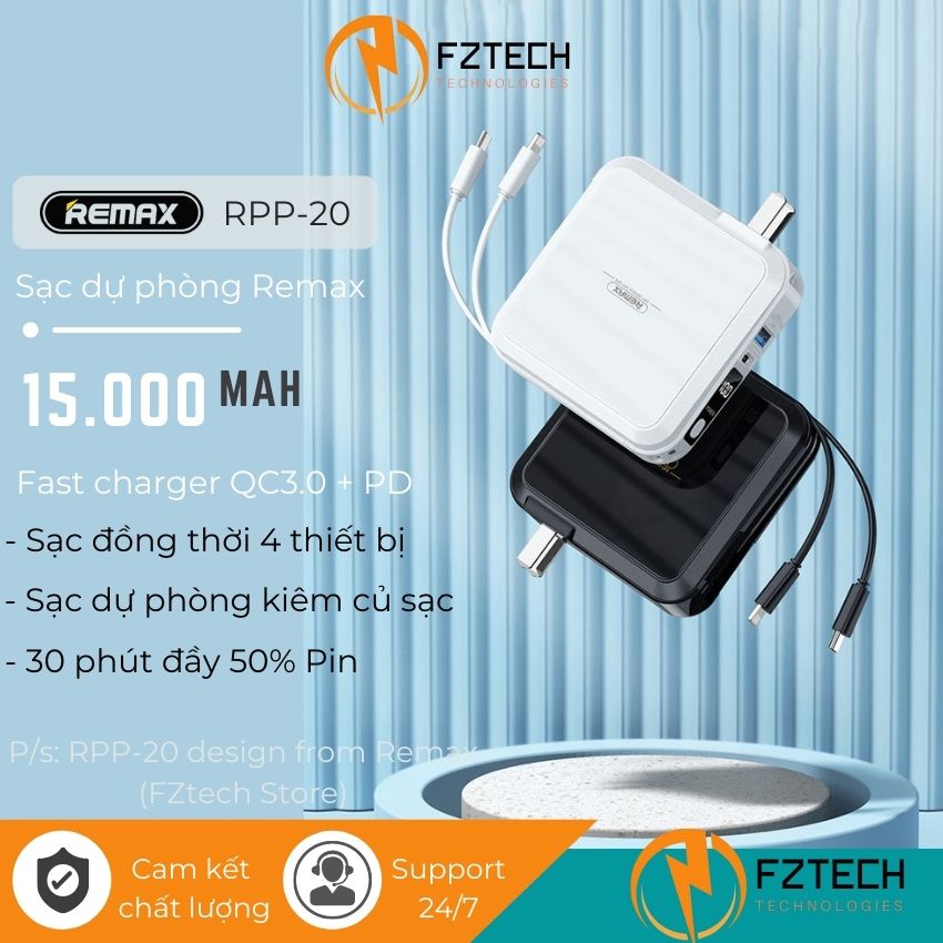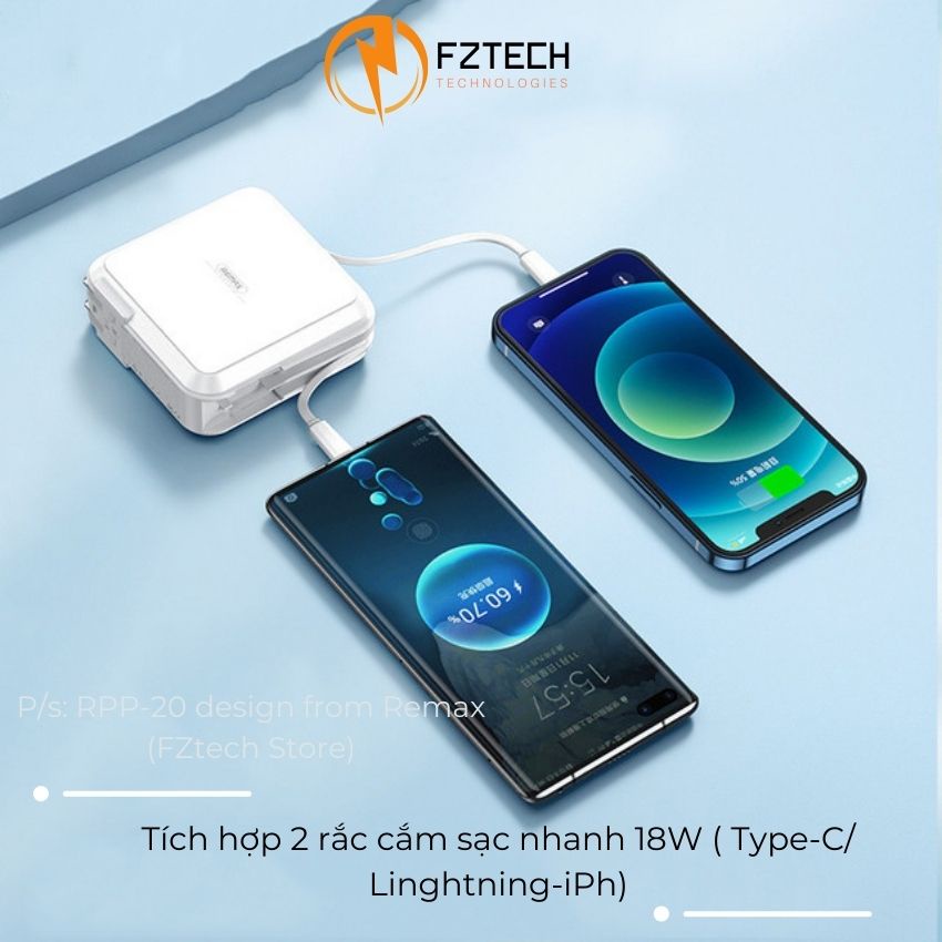 Giới thiệu Pin sạc dự phòng đa năng 1500mAh Remax RPP-20 FZTECH Sạc dự phòng kèm củ sạc nhanh 2 dây sạc Lightning và type C 18w