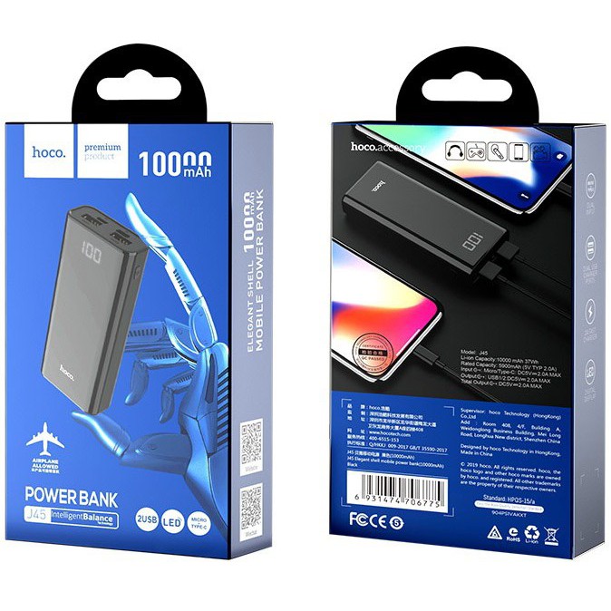 Pin sạc dự phòng di động HOCO J45 vỏ bóng sang trọng, dung lượng 10000mAh, đầu ra USB kép, nhựa PC chống cháy, màn hình LED báo mức nguồn✪ THÔNG TIN SẢN PHẨM
