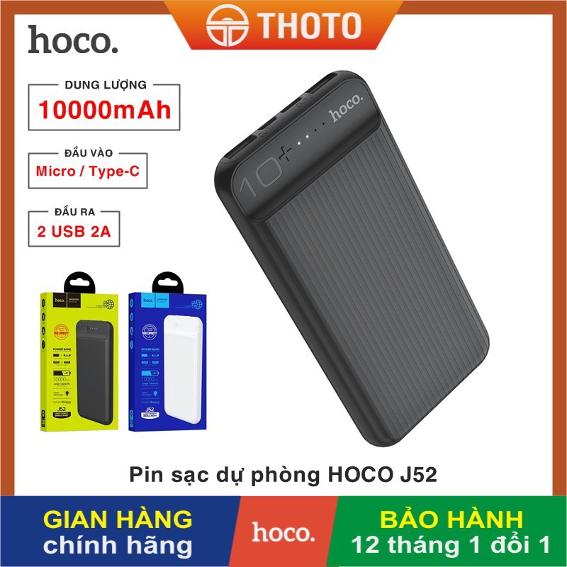 Pin sạc dự phòng di động chính hãng HOCO J52 New joy dung lượng 10000mAh, đầu vào Micro / Type-C, đầu ra 2 cổng USB 2A, đèn báo mức pin LED✪ THÔNG TIN SẢN PHẨM