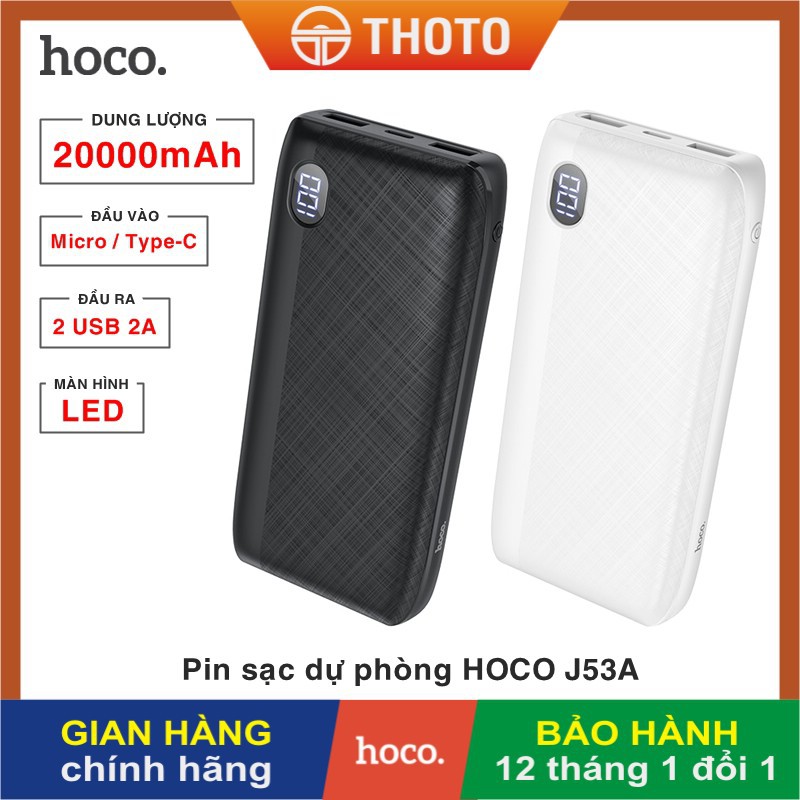 Pin sạc dự phòng di động chính hãng HOCO J53A dung lượng cao 20000mAh, đầu ra 2 cổng USB 2A, vật liệu chống cháy, màn hình LED hiển thị mức pin✪ THÔNG TIN SẢN PHẨM