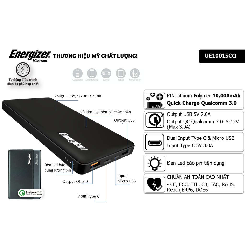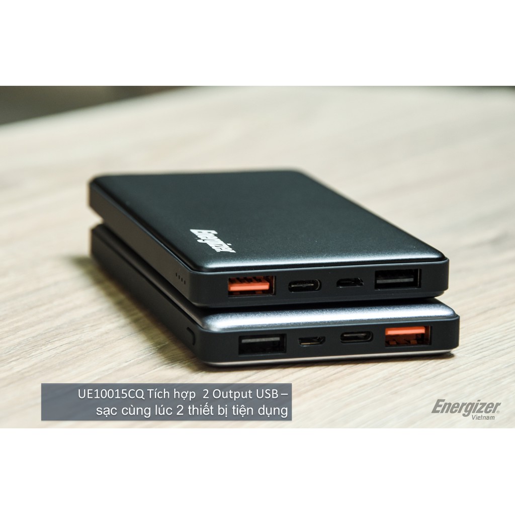 Pin dự phòng Energizer 10,000mAh QC 3.0 - UE10015CQThiết kế vỏ kim loại nhỏ gọn, Dual input Type-C & MicroUSB, OutPut USB Quick Charge 3.0