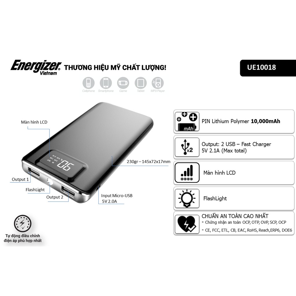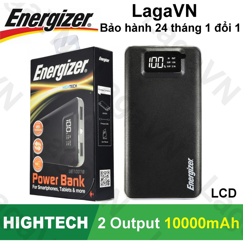 Giới thiệu Pin sạc dự phòng Energizer 10000mAh 2 cổng Output có LCD - UE10018 (Đen)