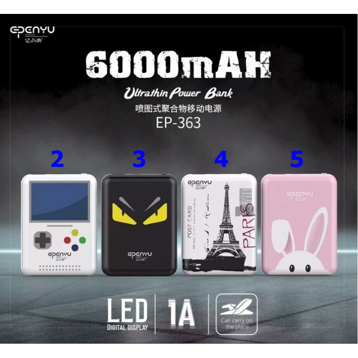 Pin Sạc dự phòng Epenyu EP363 6.000 mAh, với kích thước nhỏ nhắn, trọng lượng nhẹ, màu sắc đa dạng, tiện dụng và dung lượng khủngPin Sạc dự phòng Epenyu EP363 6.000 mAh vật dụng không thể thiếu cho các sản phẩm kỹ thuật số của bạn. Bạn có thể yên tâm thư giãn với các sản phẩm kỹ thuật số của mình, đi du lịch thả ga,… mà không cần phải bận tâm đến tình trạng dung lượng pin, thoải mái vừa chơi game, nghe nhạc, vừa xem phim, lướt web, hay gọi điện thoại tám miệt mài với người thân, bạn bè, hay người ấy của mình và vừa sạc năng lượng cho thiết bị mà không cần phải hoạt động nhiều