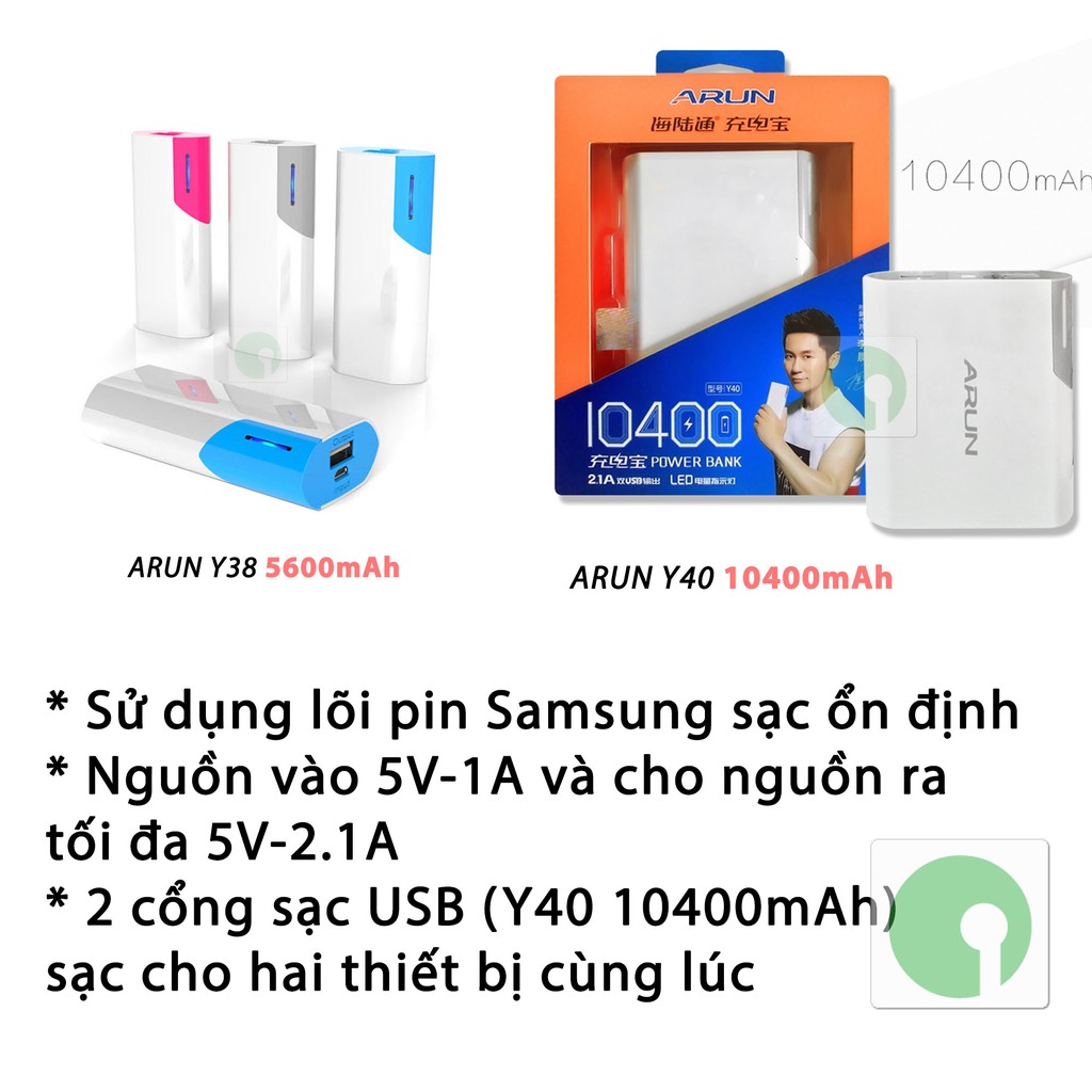 - Pin sạc dự phòng Arun 5600Mah/10400Mah (Tem Shop NCC đảm bảo) tiện lợi sẽ giúp sạc nhanh chóng điện thoại của bạn mọi lúc mọi nơi với các thao tác đơn giản. Đây là thiết bị không thể thiếu trong các chuyến du lịch, cũng như những nơi không có nguồn điện