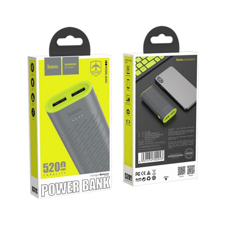 Hoco B31C Sharp hồi 5200mAh kép USB 1A đầu ra chống cháy PC màn hình LED hiển thị mức năng lượng1. Dung lượng: 5200mAh 19,24Wh.