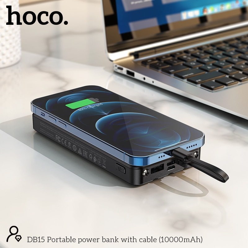 Sạc dự phòng đa năng Hoco DB15 dung lượng 10000mAh, công suất tiêu thụ, tiêu hao khi sạc đạt 70%, có thể sạc đầy từ 2-2,5 lần cho điện thoại dung lượng pin 3000mAh (như iPhone XS Max hoặc Samsung S10 Plus) tích hợp 2 cổng ra USB, 2 cổng vào MicroUSB và Type C để cắm điện cho SDP này. Đặc biệt DB15 còn tích hợp 3 dây cáp sạc ngắn, chân cắm cổng Lightning / Micro / Type-C rất tiện dụng, DB15 có 2 bóng đèn Pin để đọc sách trong trường hợp mất điện. DB15 sạc cho tất cả các thiết bị điện thoại Smartphone và máy tính bảng.