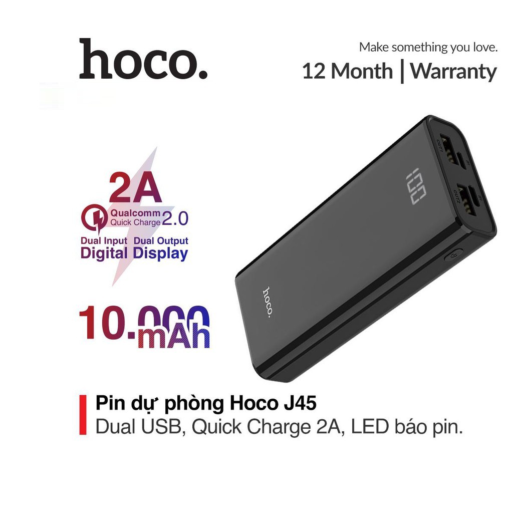 Pin sạc dự phòng Hoco J45 đèn LED báo sạc dung lượng 10000mAh hỗ trợ 2 cổng sạc chất liệu ABS + PC chống cháy"Bảo hành: 12 tháng, 1 đổi 1 trong tháng đầu nếu lỗi do nhà sản xuất.