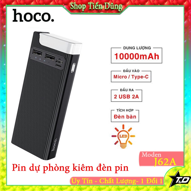 - Hoco là 1 trong những thương hiệu nổi tiếng trên thị trường, sản phẩm bán ra đều đạt công năng sử dụng tốt mà giá cả rất bình dân. Đối với sạc dự phòng J62A tích hợp chip chống cháy nổ và quá dòng, khi bạn sử dụng sẽ đảm bảo an toàn ở mức cao nhất cho điện thoại của bạn, sử dụng sạc dự phòng sẽ giảm tối đa khả năng chai pin cho điện thoại, và tiện lợi khi di chuyển.