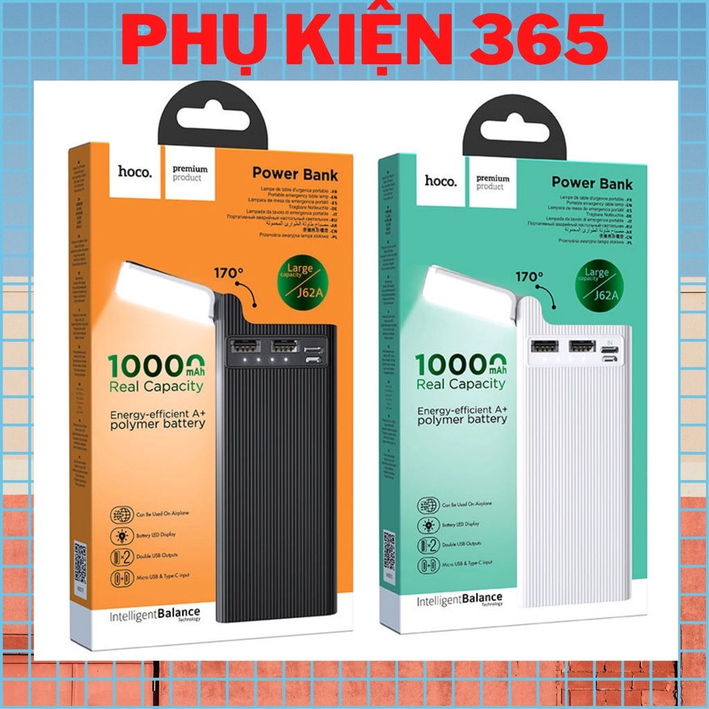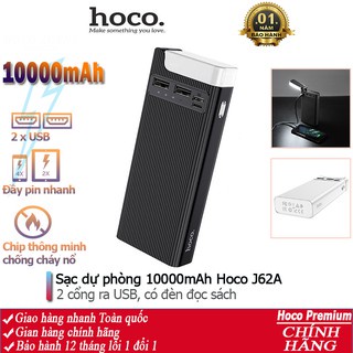 SẠC DỰ PHÒNG HOCO J62A / 10000MAH - CHÍNH HÃNGSạc dự phòng Hoco J62A dung lượng 10000mAh, đặc biệt có thêm đèn LED để đọc sách, công suất tiêu thụ, tiêu hao khi sạc đạt 70%, có thể sạc đầy từ 2-2,5 lần cho điện thoại dung lượng pin 3000mAh (như iPhone XS Max hoặc Samsung S10 Plus) tích hợp 2 cổng ra USB, 2 cổng vào MicroUSB và Type C để cắm điện cho SDP này, trên J62A có đèn LED hiển thị vạch pin. J62A sạc cho tất cả các thiết bị điện thoại Smartphone và máy tính bảng.