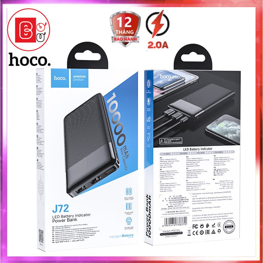 Sạc Dự Phòng Hoco J72 10.000mah CHÍNH HÃNG Có Tích Hợp Đèn Led -Bơ Bư