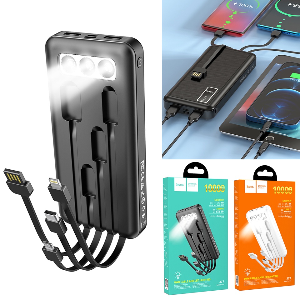 Hoco J77 được thiết kế cực kỳ độc đáo, có sẵn 3 dây sạc ra đi liền với pin nên có thể sạc được tất cả các thiết bị và còn có 2 cổng USB => có thể sạc cùng lúc 5 thiết bị, ngoài ra để sạc cho pin thì đã có sẵn 1 cáp USB-A liền pin, chỉ cần cắm vào củ sạc hoặc ổ điện có cổng USB là có thể sạc được, cực kỳ độc đáo và tiện lợi. Ngoài ra pin còn tích hợp thêm một đèn pin siêu sáng để thuận tiện đi trong tối.