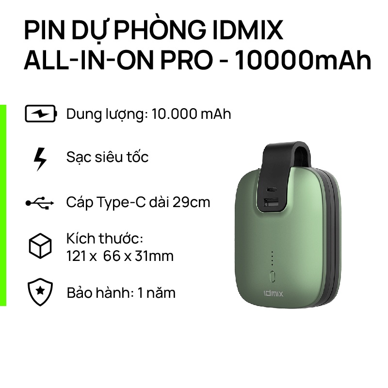 Điện Thoại & Phụ Kiện > Phụ kiện > Sạc dự phòng & Pin > Sạc dự phòng || Pin sạc dự phòng IDMIX All in on Pro thiết kế gọn nhẹ, dung lượng 10.000 mAh, dây cáp Type-C có sẵn dài 29cm, cổng TypeCòn hàng
