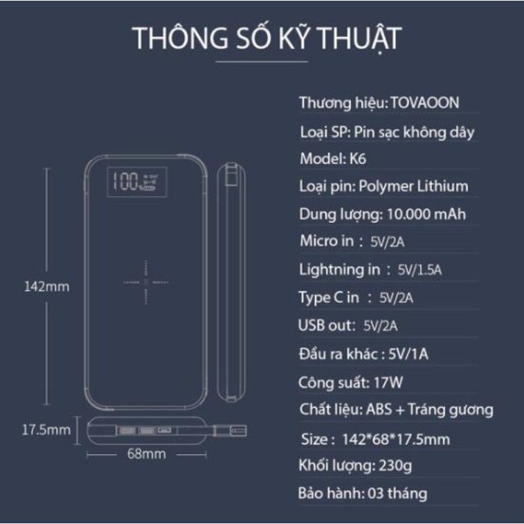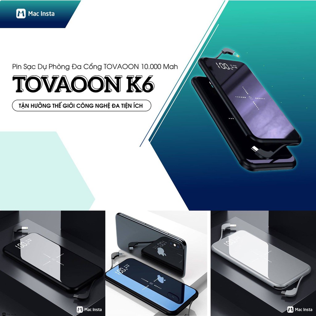PIN SẠC DỰ PHÒNG KHÔNG DÂY ĐA CỔNG K6 10000MAH: HIỆU NĂNG HOÀN HẢO, SẠC CHẤT LƯỢNG CAO"Với thiết kế bề mặt tráng gương sang trọng, PIN SẠC DỰ PHÒNG KHÔNG DÂY ĐA CỔNG K6 10000MAH chính là củ pin dự phòng bạn nên sở hữu. Bên cạnh thiết kế đẹp cho phép bạn mang theo mọi lúc mọi nơi thì pin sạc không dây K6 còn là một sản phẩm có dung lượng pin khủng lên tới 10000mAh cùng với khả năng cung cấp năng lượng cho tới 4 thiệt bị cùng lúc mà vẫn ổn định được dòng điện. Hiệu năng sạc ổn định, chất lượng cao cho phép tích hợp sạc nhanh không dây, hứa hẹn sẽ trở thành một phụ kiện bỏ túi tuyệt vời của bạn đấy!