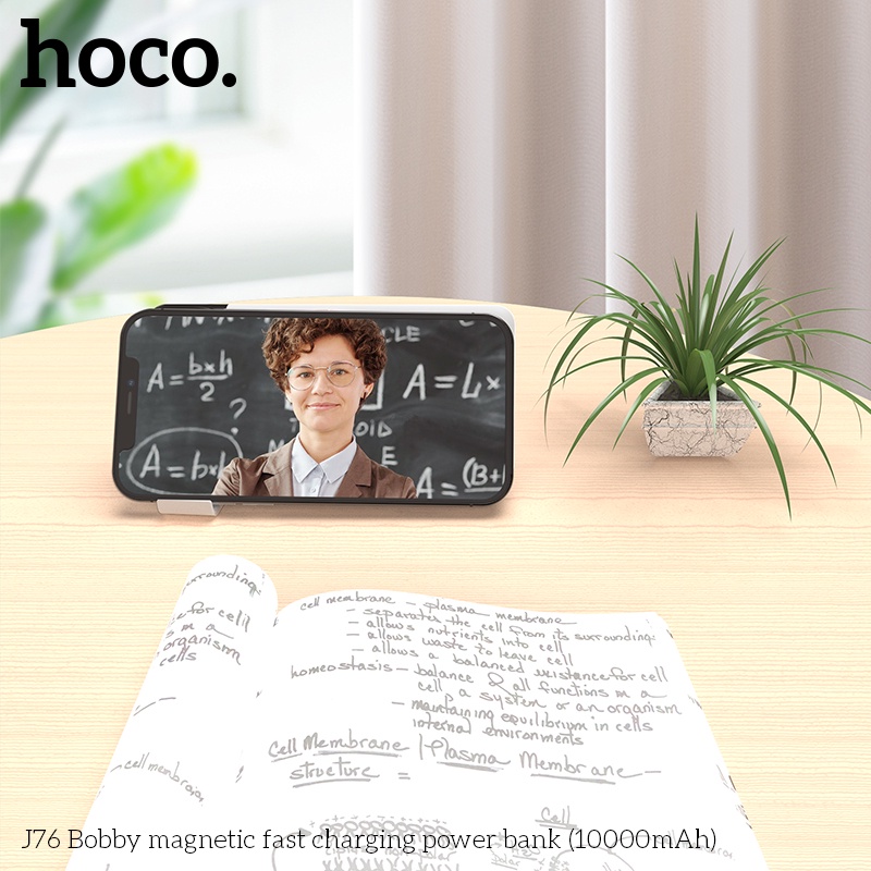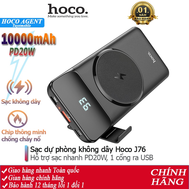 SẠC DỰ PHÒNG HOCO J76 SẠC KHÔNG DÂY SIÊU TỐC PD 20W / 10000MAH - CHÍNH HÃNGSạc dự phòng Hoco J76 hỗ trợ sạc không dây, công suất PD20W sạc nhanh siêu tốc, dung lượng 10000mAh, công suất tiêu thụ khi sạc đạt 70%, có thể sạc đầy từ 2-2,5 lần cho điện thoại dung lượng pin 3000mAh (như iPhone XS Max hoặc Samsung S10 Plus) tích hợp 1 cổng ra USB, 2 cổng vào MicroUSB và Type C để cắm điện cho SDP này, trên J76 có đèn LED hiển thị vạch pin. J76 sạc cho tất cả các thiết bị điện thoại Smartphone và máy tính bảng, hỗ trợ sạc không dây với các dòng máy có tính năng này.